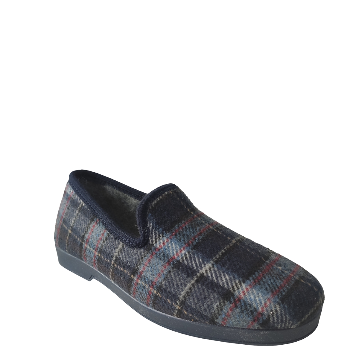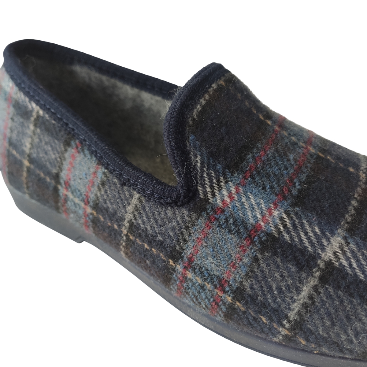 Men's ALCALDE closed slipper in blue checkered color with a very soft texture and warm inside, with a rubber sole to prevent slipping. Ideal for keeping your feet warm on cold winter days. Its line is regular.