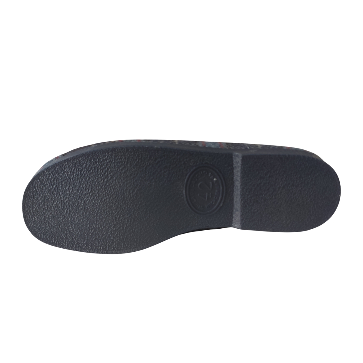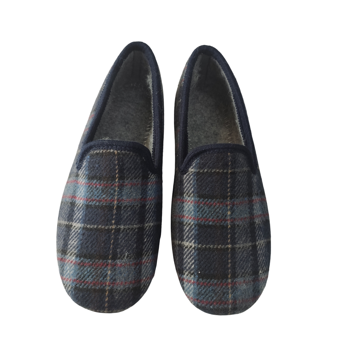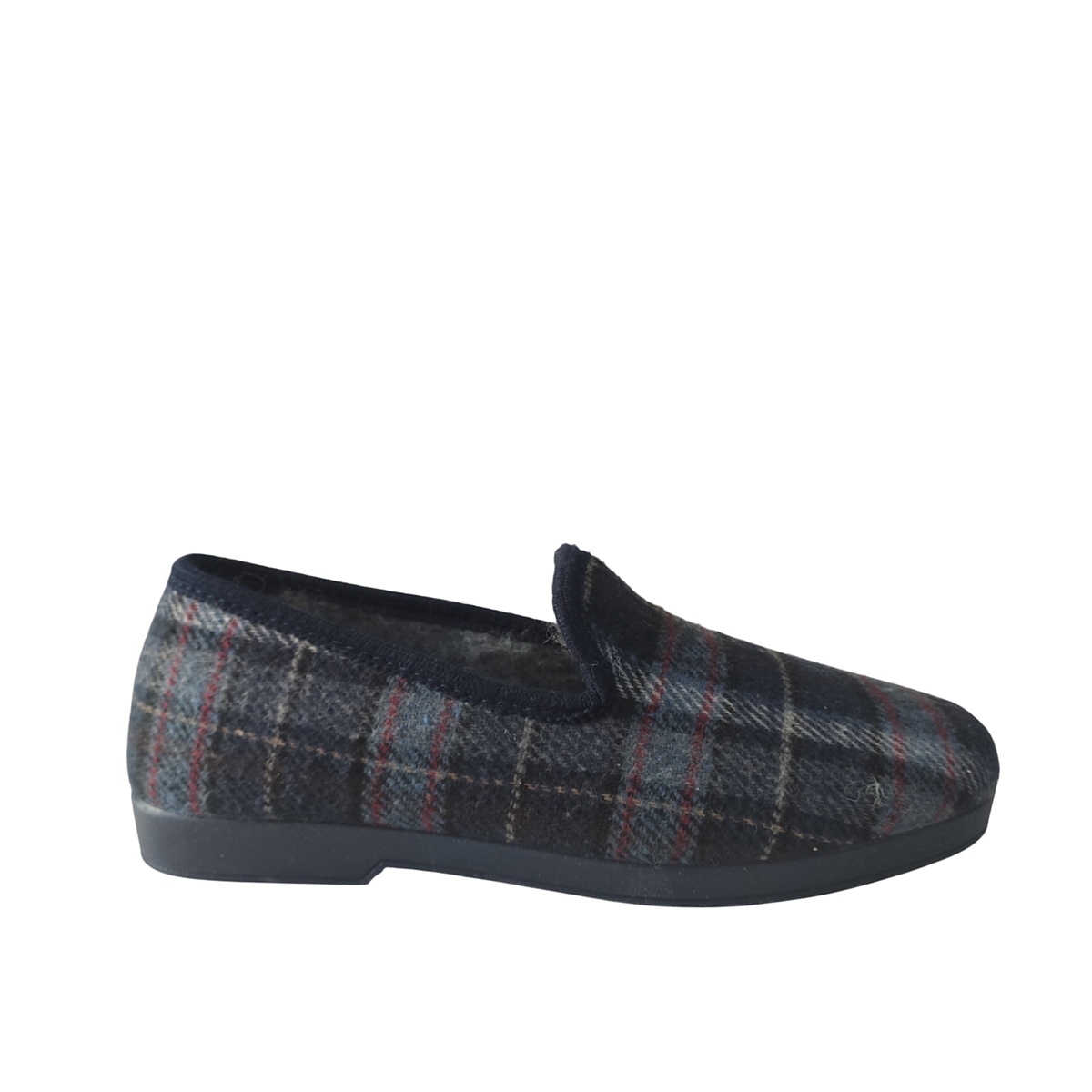 Ανδρική παντόφλα ALCALDE κλειστή σε μπλε καρο χρώμα με πολύ μαλακή υφή και ζεστή στο εσωτερικό της , με λαστιχένιο πάτο για να μην γλιστράει.Ιδανική για να κρατάει ζεστά τα πόδια σας στις κρύες μέρες του χειμώνα.Η γραμμή της είναι κανονική.