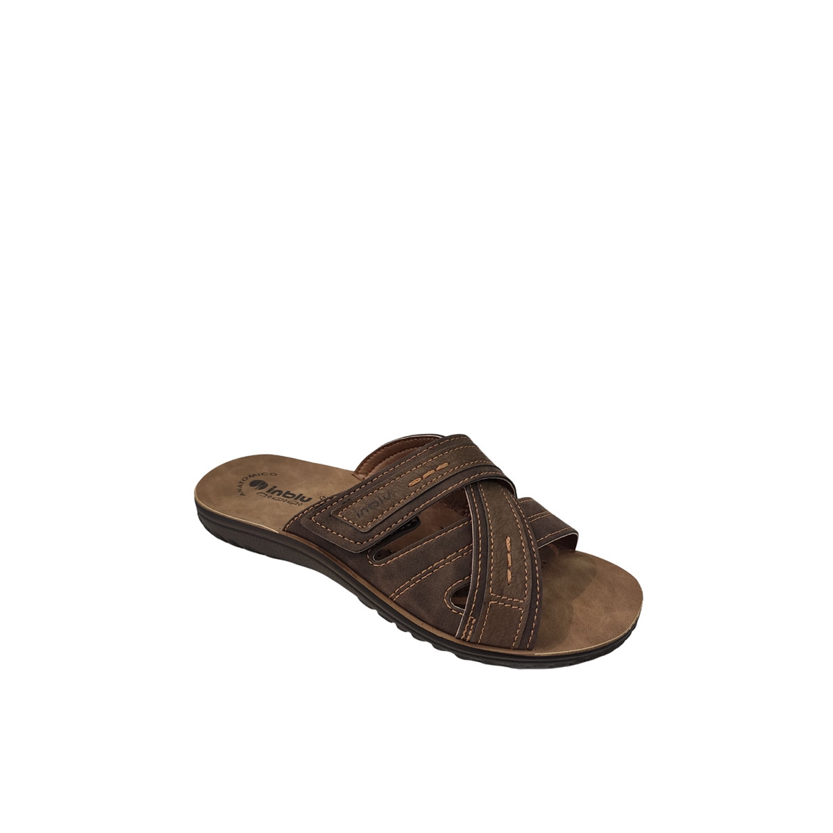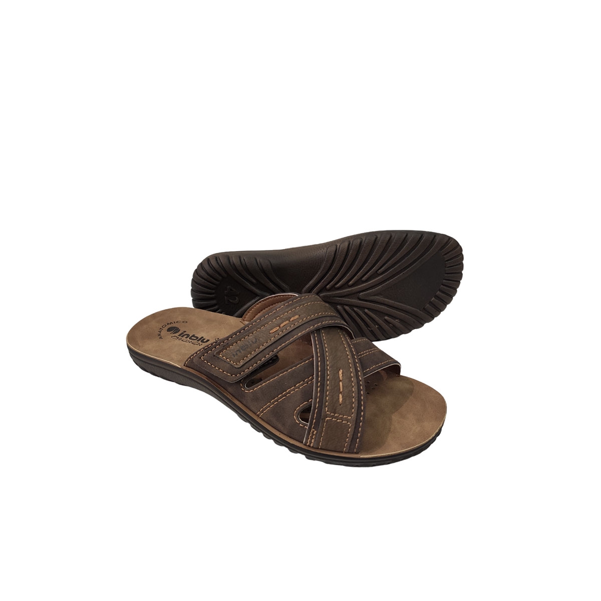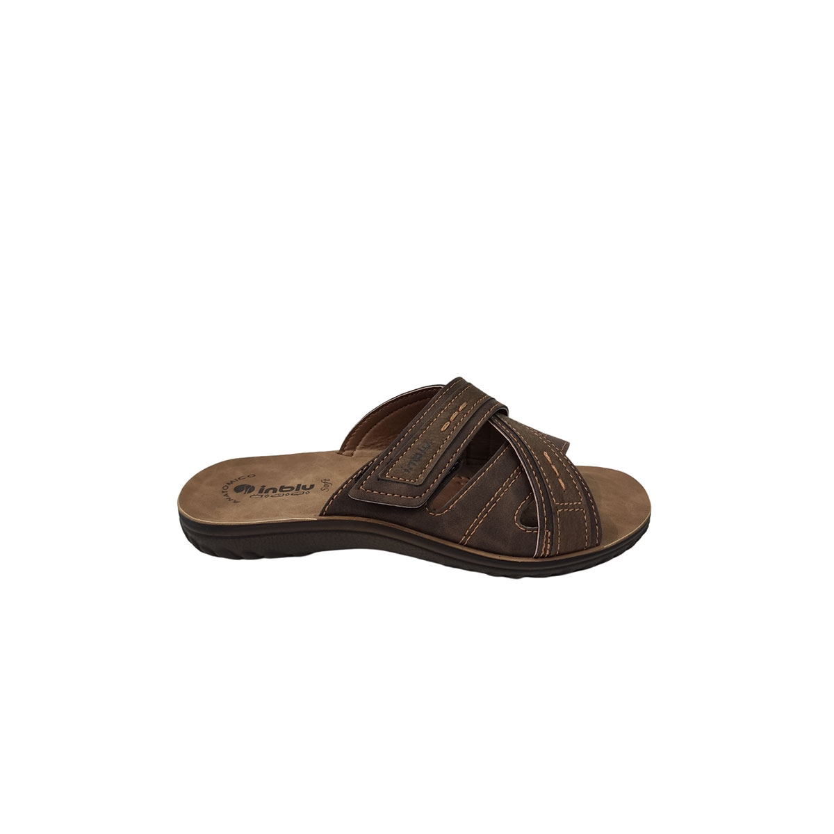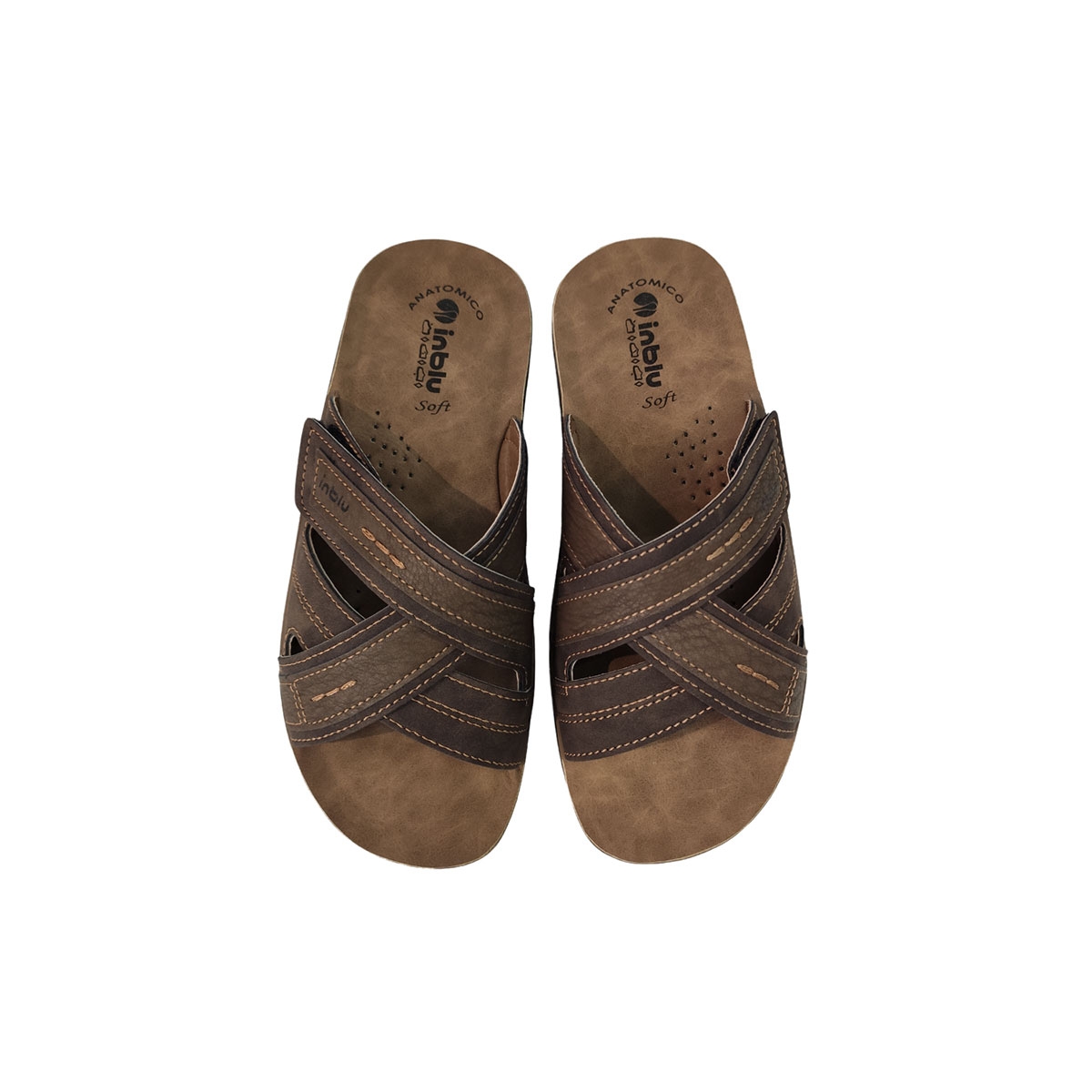 Ανδρική παντόφλα INBLU Ιταλικής εταιρείας σε χρώμα καφέ, το πάνω μέρος ειναι απο συνθετικό δέρμα και εσωτερικά η επένδυση με συνθετικό δέρμα, έχει αυτοκόλλητο στο κουτουπιέ για καλύτερη εφαρμογή.